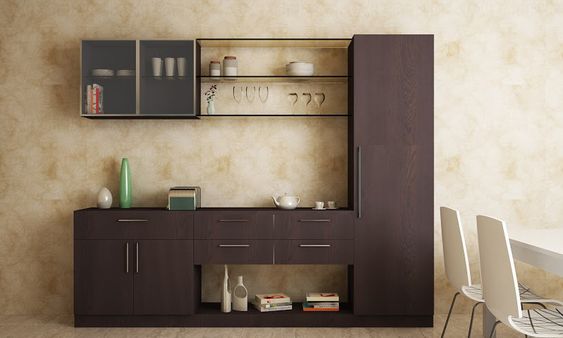 As the name suggests, these units are fixed to a wall in the dining room. They keep the floor free. This style is a winner for compact homes because it creates the illusion of a bigger space without compromising on storage.They are convenient and can be made as functional or as stylish as you would like. While crockery cabinets have wooden doors others are built with glass. These units work great in corner areas or small homes where space is at a premium.Floating shelf cabinet design add straight lines, which pair well with modern decor. You can display your crockery unit with a more welcoming feel without the use of cabinet design doors. By coupling your shelves with a glass or shiny subway tile back-splash, you can add a dynamic characteristic to your crockery. Floating shelf cabinet design gives a fresh and sophisticated look, making your cabinet design extremely sleek.